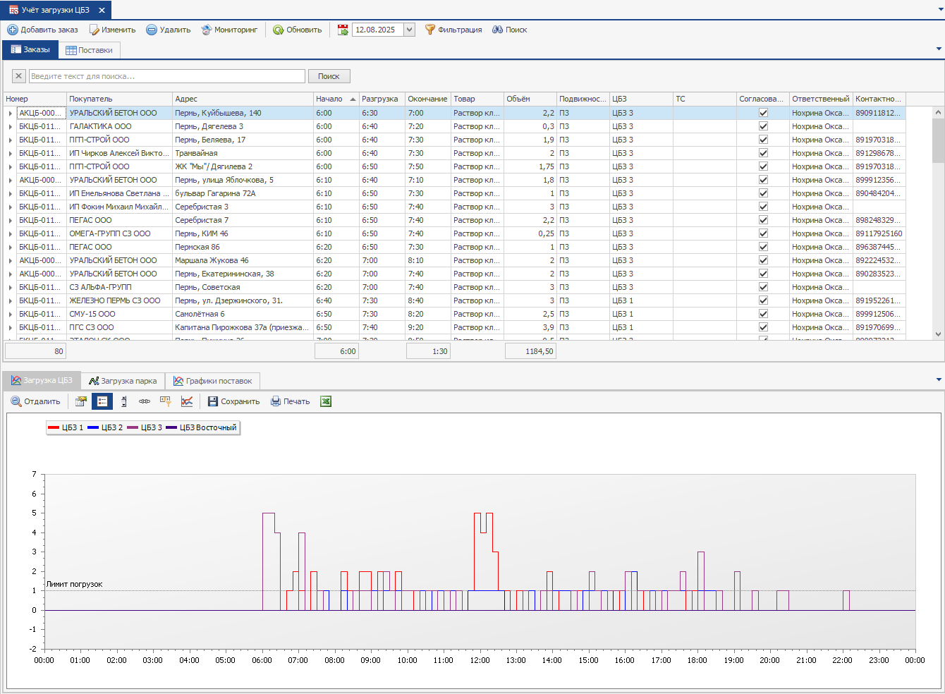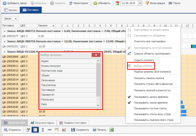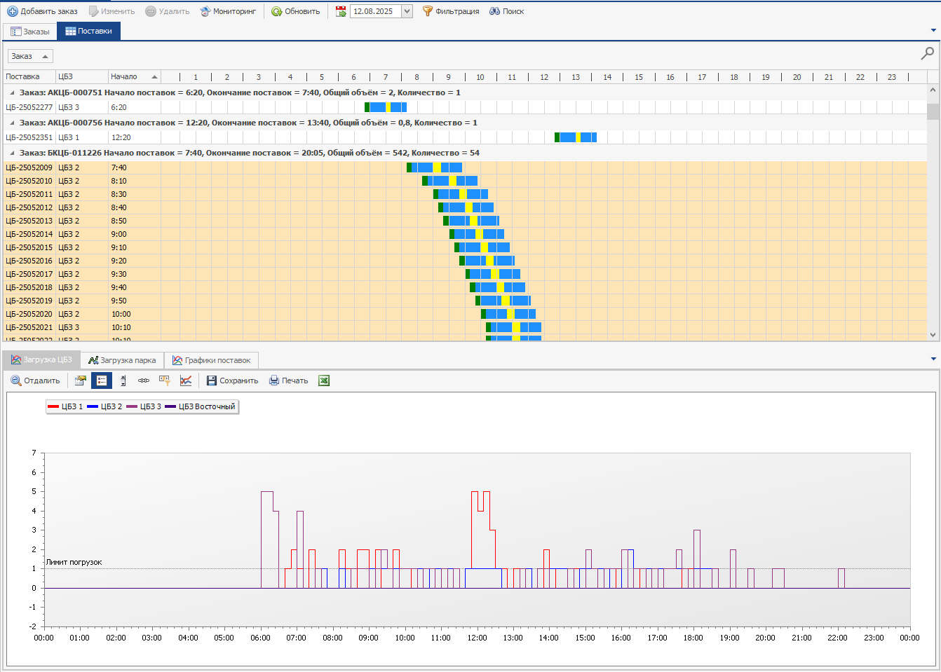 Помимо вкладки заказы, есть вкладки поставок, в данных вкладках отображаются занятые на поставки слоты, по каждому ЦБЗ отдельно. Также, в нижней части экрана находится график загрузки парка.
