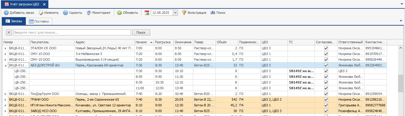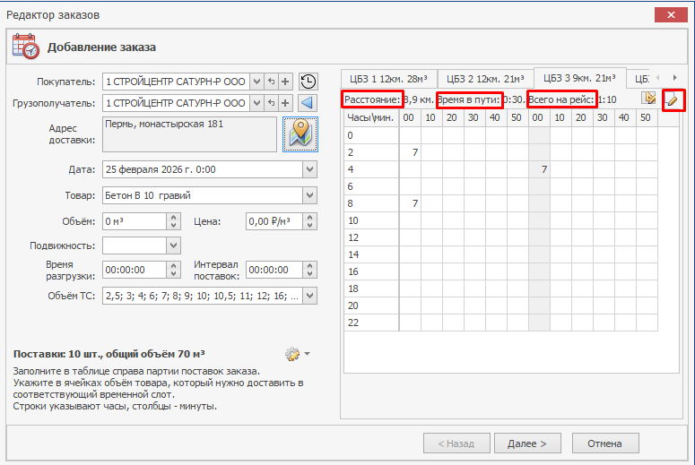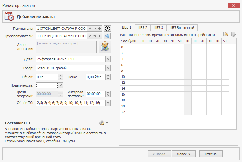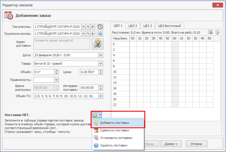 В правой части редактора заказа находятся вкладки, на которых указаны ЦБЗ (заведенные в справочнике «Станции»), для каждого ЦБЗ в данном окне находится матрица времени, где в качестве строк выступают часы, а в качестве столбцов - минуты. В данной таблице указываются поставки, т.е. объем бетона, который будет доставляться в соответствующее время. Под матрицей подписывается выбранный слот, по которому указывается время, количество занятых машин, слот погрузки, состояние слота (занят/свободен) и т.д. В ячейках можно указать объем каждой поставки по заказу.