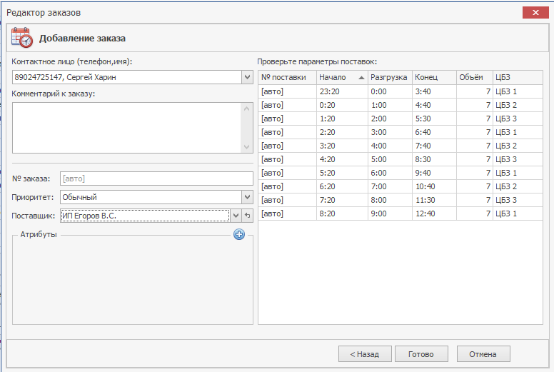 В правой части окна отображаются все поставки, которые были заведены на первом шаге. После нажатия кнопки «Готово» сформируется заказ со всеми поставками.