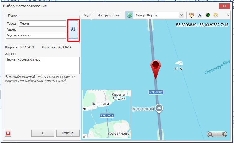 Откроется окно выбора (можно выбрать адрес щёлкнув по карте, либо указать адрес в окне ввода адреса и нажать кнопку поиска)