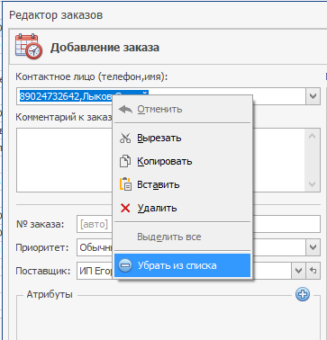 ВАЖНО! Все указанные контактные лица запоминаются системой для выбранного предприятия, которое было выбрано как покупатель. Также, сохраненные контактные лица можно удалять, необходимо нажать правой кнопкой мыши по нему и выбрать в контекстном меню «Убрать из списка».