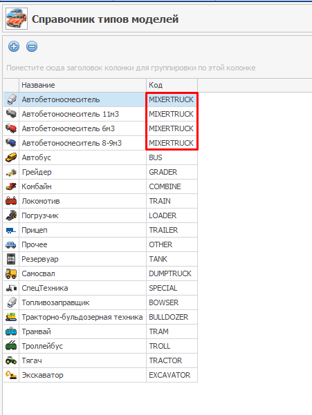 ВАЖНО! Техника должна относиться к соответствующим моделям с типом техники, код которой «MIXERTRUCK». Типы моделей находятся в справочнике «Типы моделей» (в случае отсутствия данного типа, его можно добавить нажав (+)).