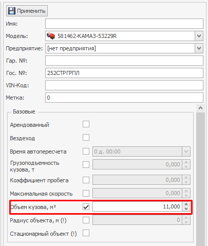 Также, после того, как мобильный объект добавлен, необходимо обратить внимание на окно справа, у техники должен быть задан объем кузова (это базовый атрибут):