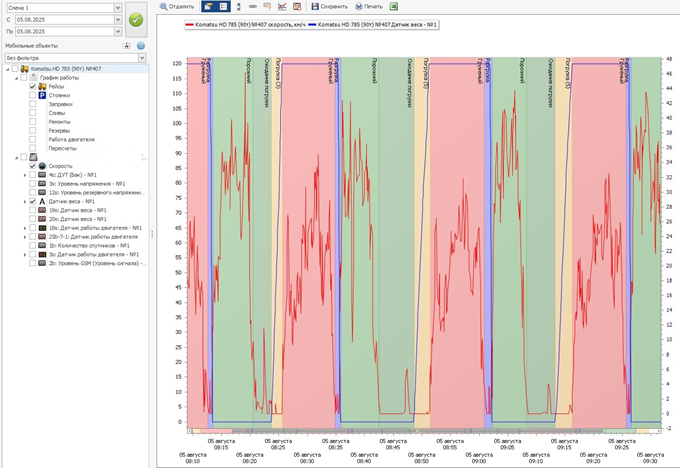 График работы — показывает интервалы ремонтов, резервов, рейсов, стоянок, работы двигателя и отсутствие связи.