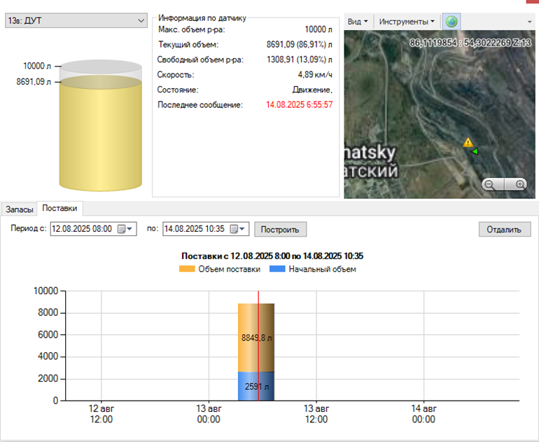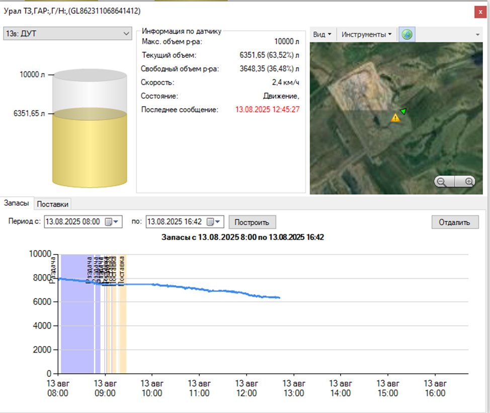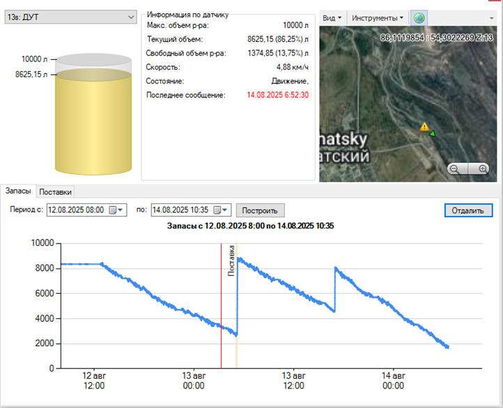 Информация в инструменте обновляется в реальном времени при поступлении данных от ДУТ.