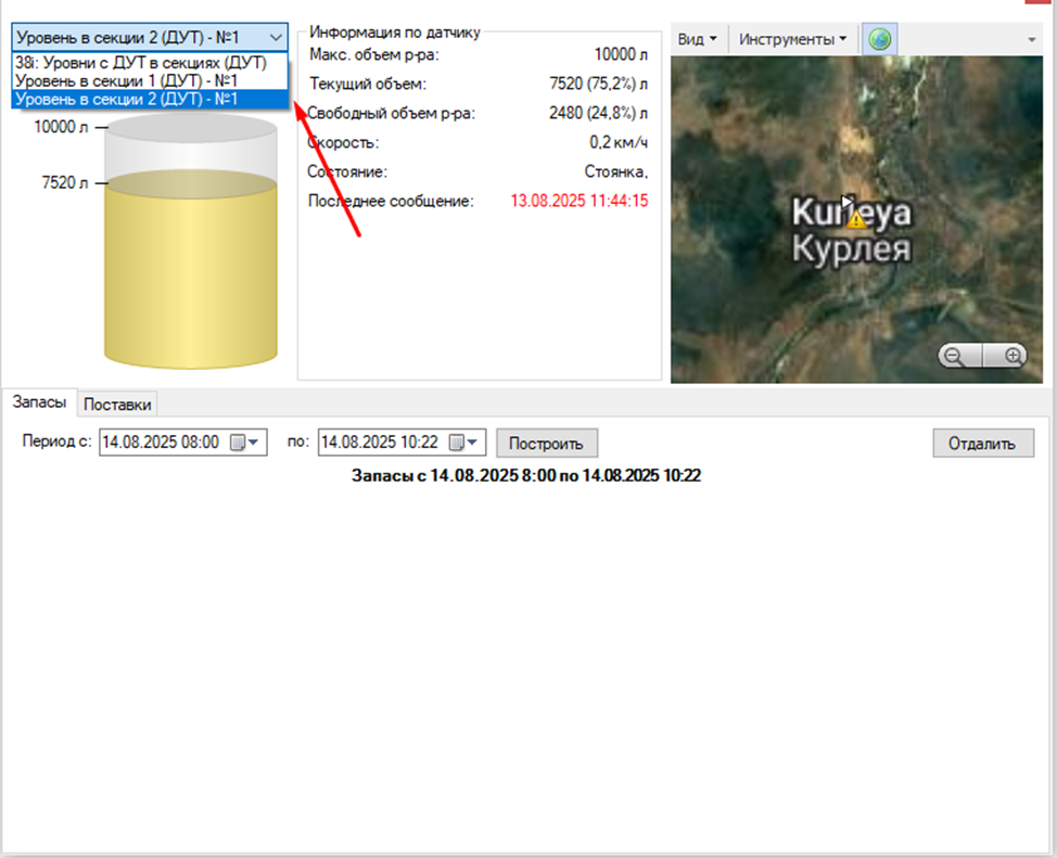 Если цистерна имеет две секции и установлено два ДУТ, то между ними можно переключаться с помощью выпадающего списка датчиков в левом верхнем углу окна.
