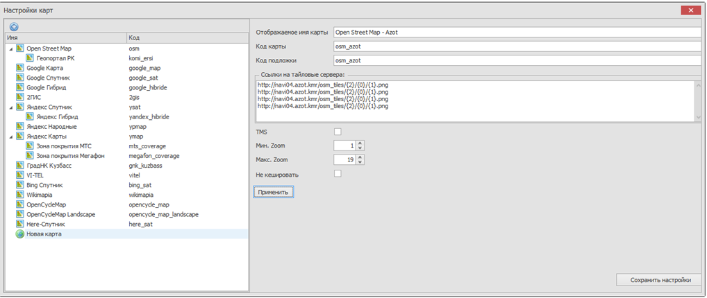 Если доступ к тайловому серверу установлен, новая карта появится в списке доступных карт.