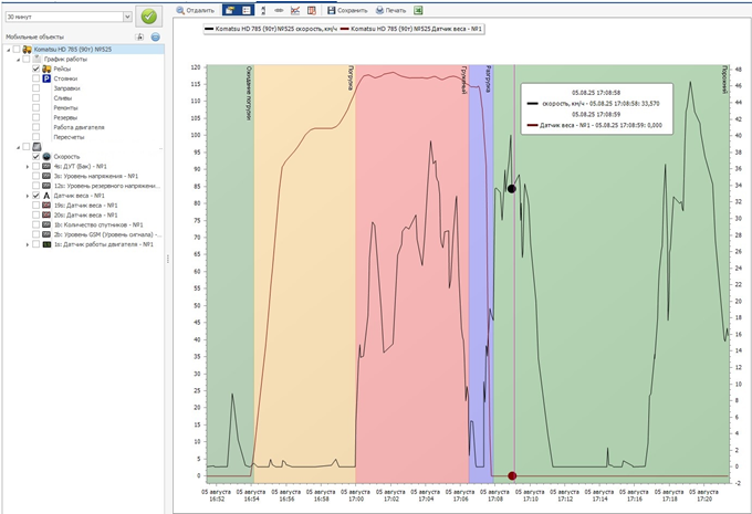 График работы — выделяет интервалы рейсов, стоянок, резервов, ремонтов, работы двигателя и отсутствия связи.