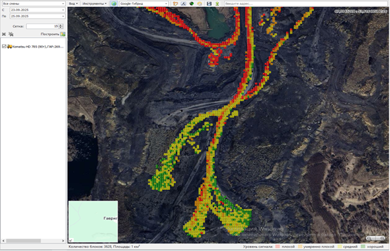 На карте покрытие отображается в виде цветных ячеек сетки, отражающих уровень сигнала и плотность движения техники.