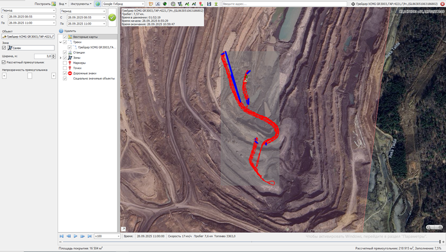 Инструмент «Покрытие участка» используется для расчёта площади, обработанной техникой, на основании треков движения.