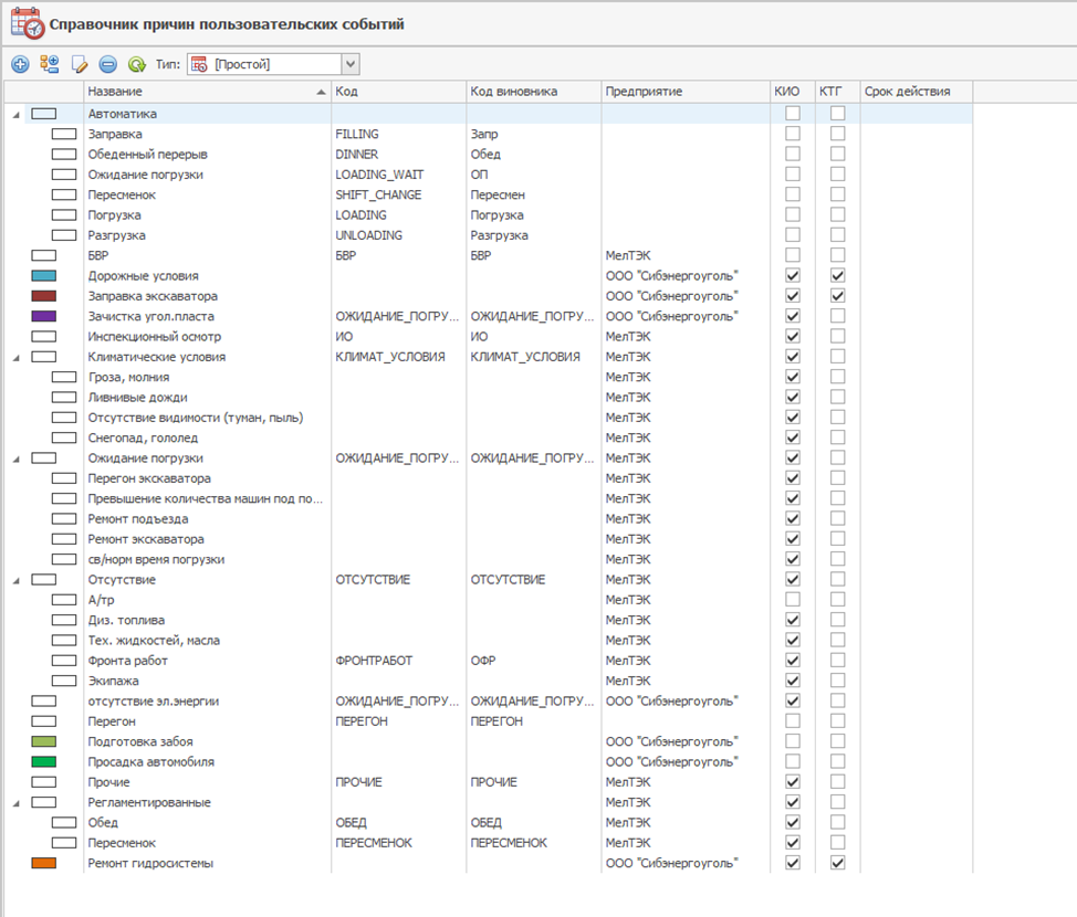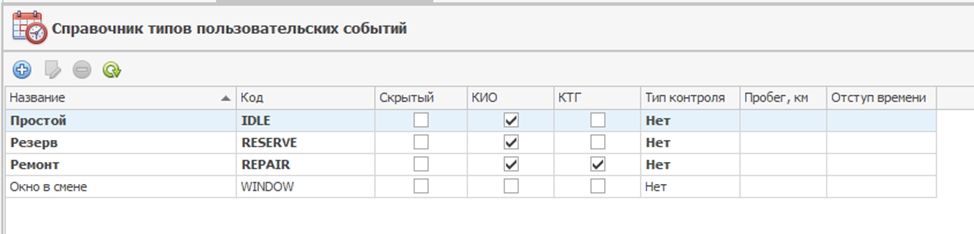 Системные типы событий - простой, ремонт и резерв - используются чаще всего в горном модуле, однако при необходимости пользователь может добавить собственные типы событий.