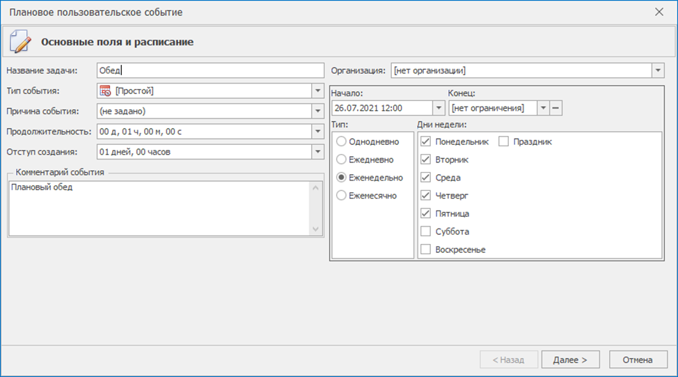 Отступ создания - период, за который событие создаётся заранее (от 12 часов до 7 суток).