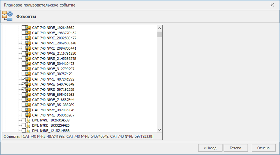 📍 На второй странице мастера выбираются объекты с помощью фильтра, аналогичного фильтрам в тревогах. Можно задать конкретные машины, группы, модели или типы техники.