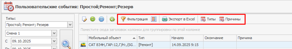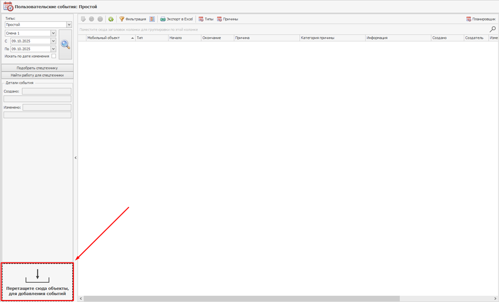 Инструмент «Пользовательские события» предназначен для ведения учёта простоев, резервов, ремонтов и любых других пользовательских событий, которые влияют на показатели эффективности работы техники. С его помощью можно отслеживать причины неработоспособности техники, анализировать простои, а также автоматически формировать отчёты по КТГ и КИО.