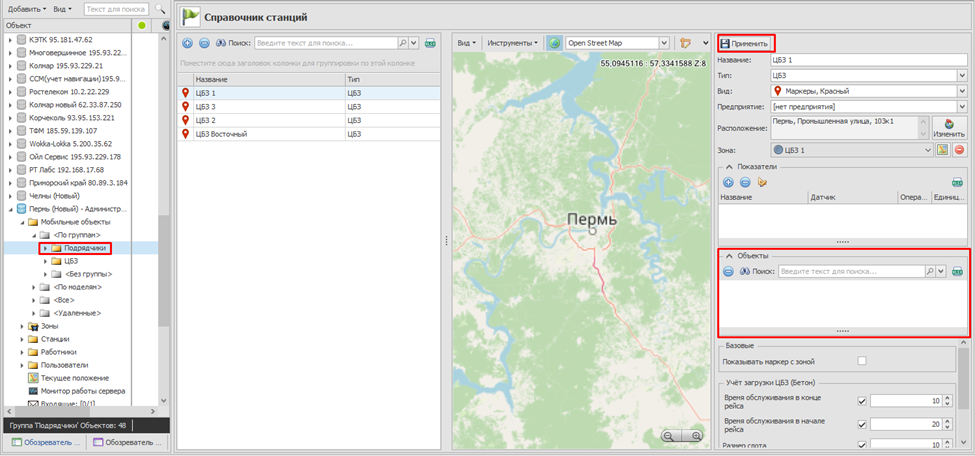 Необходимо закрепить за станцией технику. Для этого, зажимаем левой кнопкой мыши папку с техникой в обозревателе объектов, перетаскиваем ее в поле «Объекты» и нажимаем «Применить»: