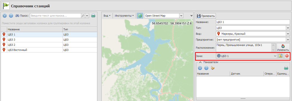 Далее добавляем зону к станции (зона должна быть создана заранее в справочнике зон), нажимаем на окошко справа он надписи «Зона»: