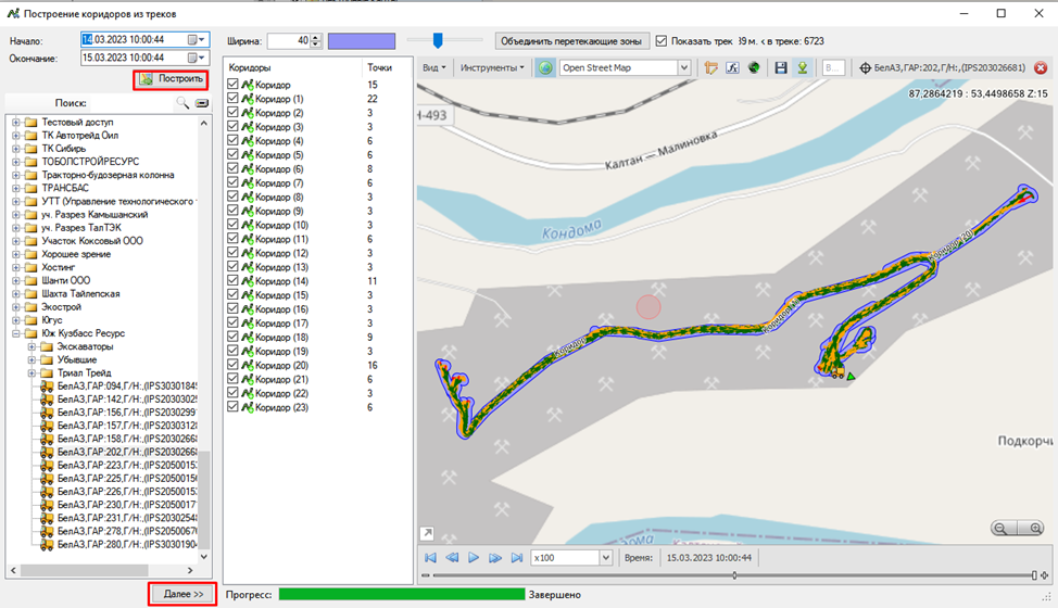 Для построения коридора можно использовать «Построение коридоров из треков»: выберите объект, период, нажмите Построить - Далее.