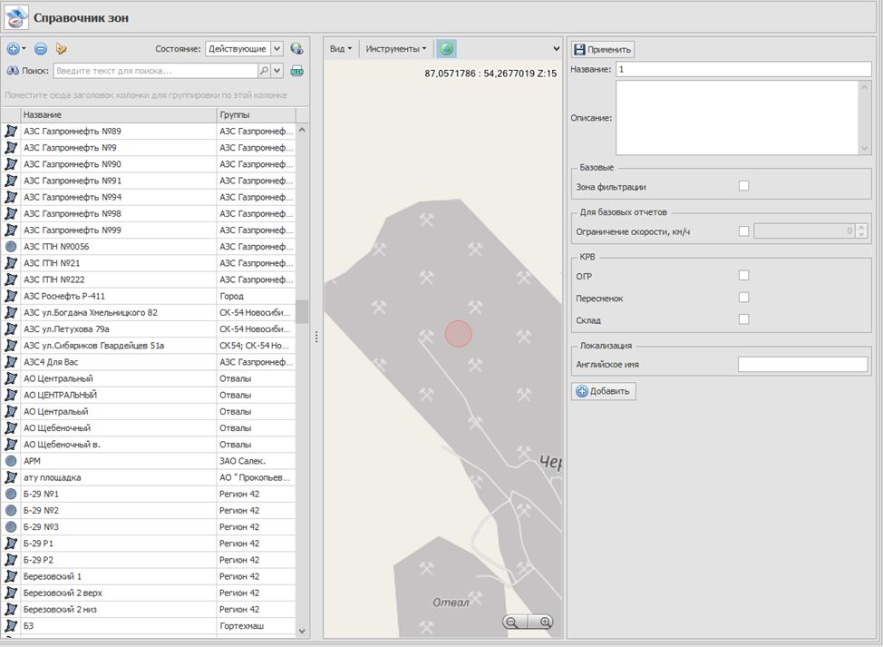 Справочник «Зоны» предназначен для просмотра, создания и редактирования зон на карте. Для работы с ним выберите пункт «Зоны» в меню Справочники.