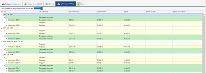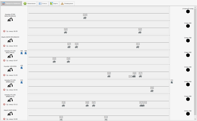 В левой части окна показываются экскаваторы или зоны погрузки, среднее время ожидания погрузки и список самосвалов, ожидающих погрузку.