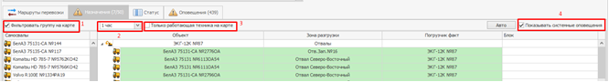 Фильтровать группу - отображение техники под выбранным экскаватором.