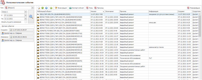 На ремонте или В резерве - выставляется вручную (через «Пользовательские события» или «Горные смены»).
