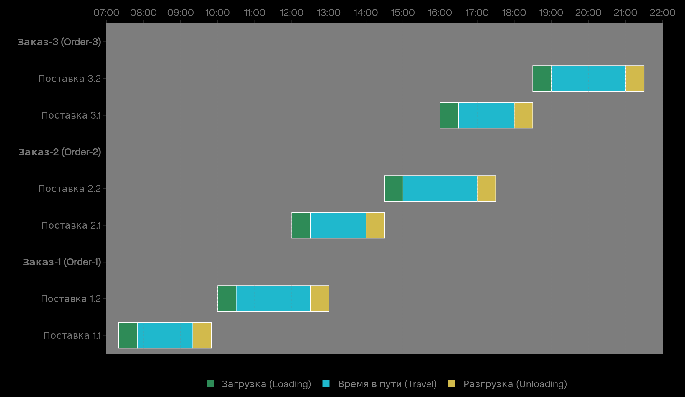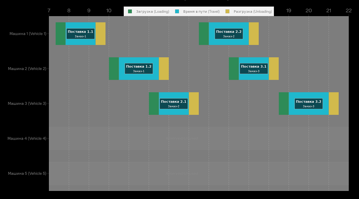 Критическое правило: Для каждой машины нет временных пересечений. Машина может выполнять несколько поставок из разных заказов, но только последовательно, одну за другой.