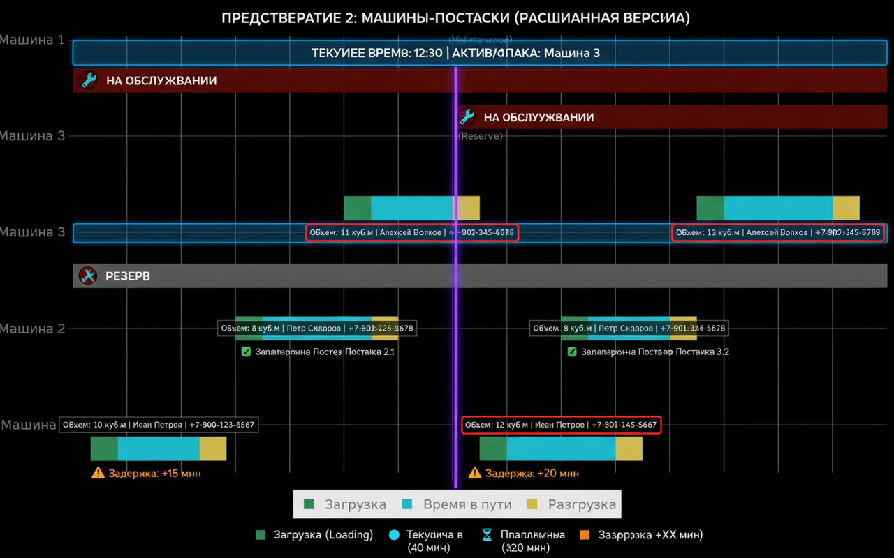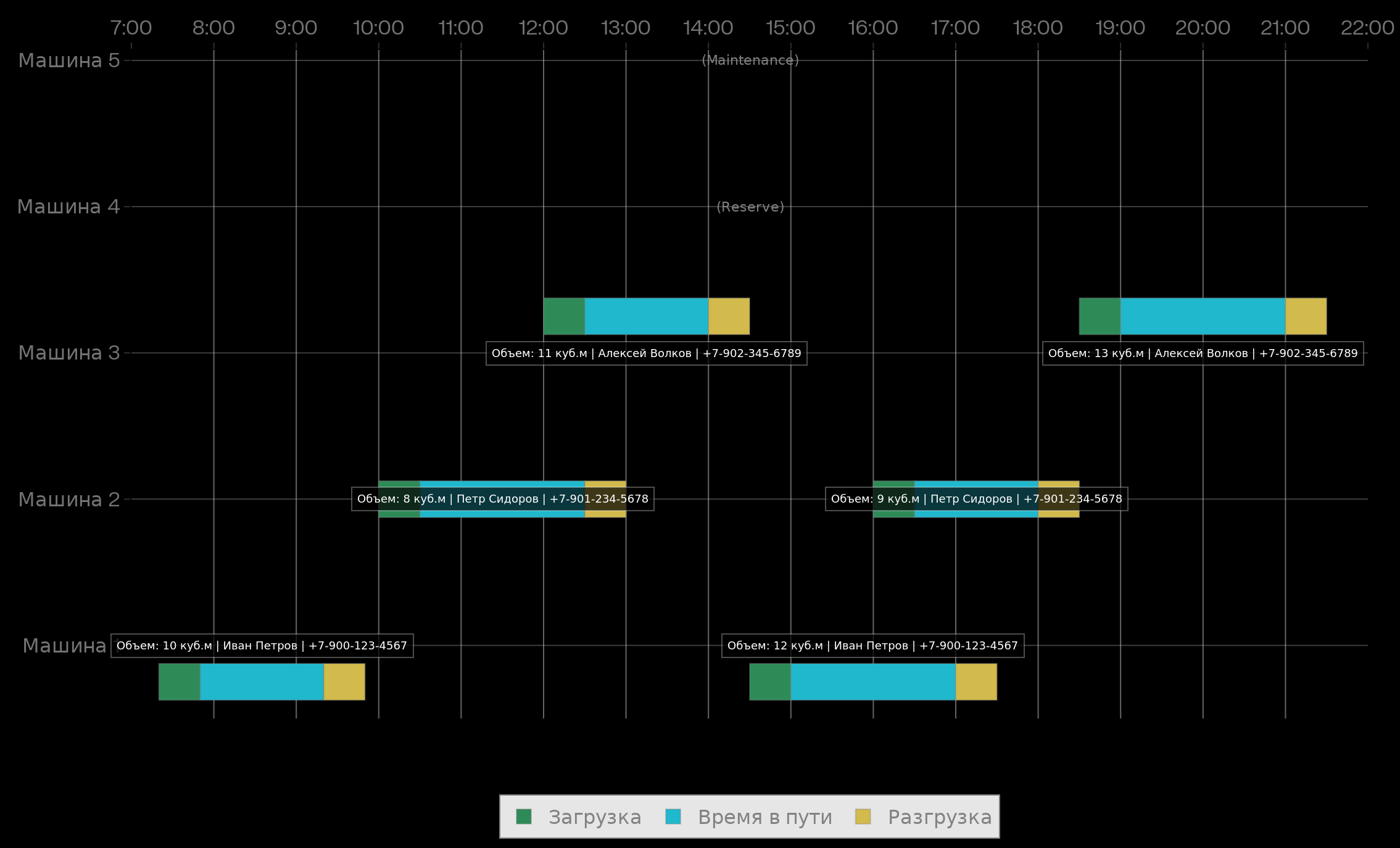 Назначение этого представления: Логист видит, как используется каждая машина, какой у нее дневной график, где есть промежутки времени для отдыха водителя, и какой резерв остается на экстренные заказы.