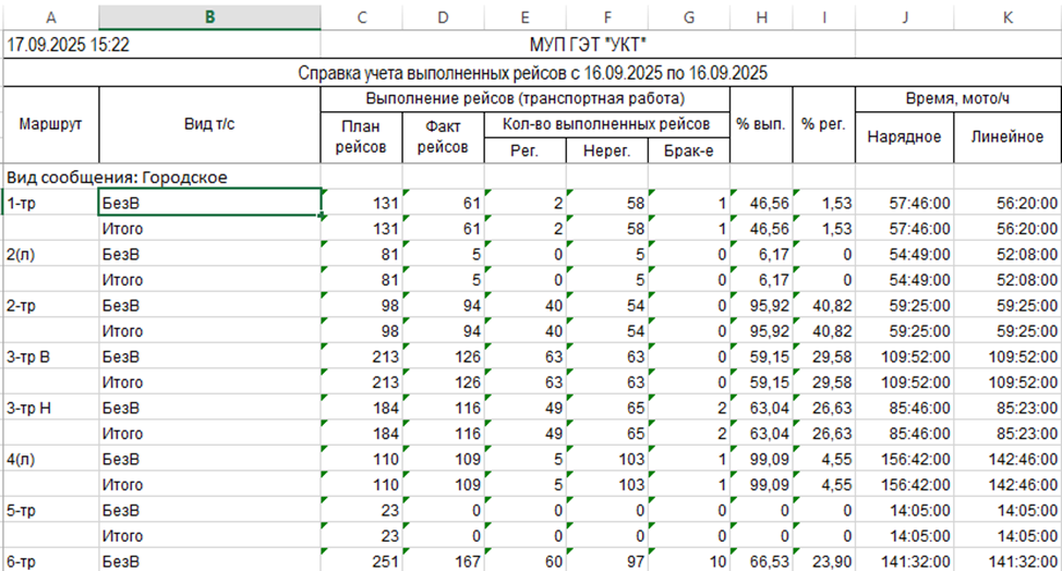 В инструменте "Пассажирский транспорт" отчёт строится по логике производственного контроля: отчет отражает, как выполняется план перевозок по маршрутам и времени эксплуатации, а также дает возможность увидеть отклонения и качество работы. В отчете фиксируется плановое задание, фактические показатели и уровень их выполнения, что позволяет оценить эффективность и дисциплину транспортного подразделения.