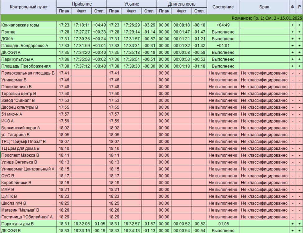Отчёт предназначен для контроля и анализа выполнения маршрута конкретным водителем за выбранный период. Он отражает соблюдение расписания движения, фактическое выполнение контрольных пунктов, наличие отклонений по времени, а также фиксирует случаи невыполнения и брака. Отчёт используется для оценки дисциплины водителя, качества выполнения рейсов и расчёта показателей регулярности.