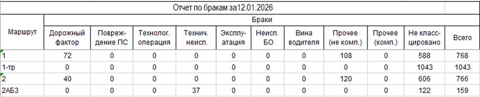 Отчёт предназначен для учёта и классификации нарушений в работе транспорта (браков) за отчётный период. Он систематизирует случаи сбоев по различным причинам: дорожные условия, технические неисправности, человеческий фактор и другие. Отчёт позволяет выявлять основные источники проблем, оценивать качество эксплуатации транспорта, планировать ремонтные работы и принимать меры по снижению количества браков.