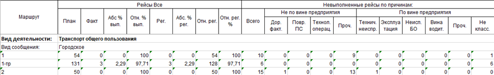 Отчёт предназначен для комплексного анализа выполнения рейсов по маршрутам с детализацией причин невыполнения. В нём сравниваются плановые и фактические показатели, рассчитываются проценты выполнения и регулярности, а также производится классификация срывов рейсов по виновным сторонам (предприятие/внешние факторы). Отчёт используется для оценки качества перевозок, выявления системных проблем и планирования корректирующих мероприятий.