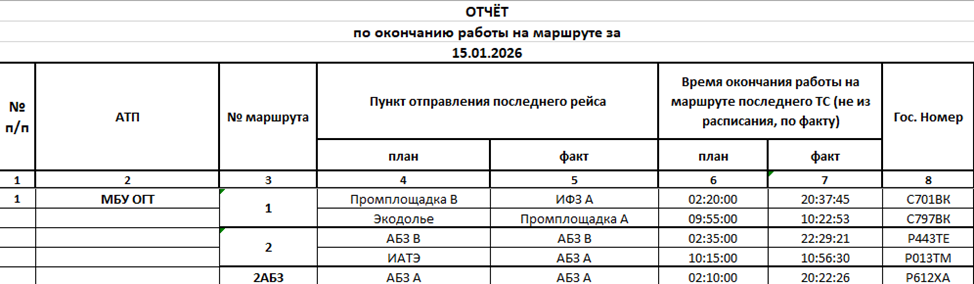 Отчёт фиксирует фактические данные завершения работы транспортных средств на маршрутах в сравнении с плановыми показателями. Содержит информацию о последнем рейсе каждого ТС: пункт отправления и время окончания работы. Используется для контроля соблюдения графика окончания смен, анализа причин задержек и планирования вечернего заезда транспорта в парк.