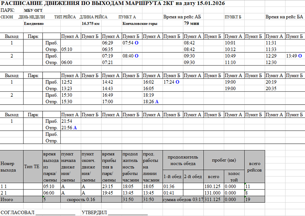Отчёт представляет детализированный график работы транспортных средств на маршруте с разбивкой по выходам (сменам). Содержит информацию о парке, сезоне, днях недели, длине маршрута, времени на рейсы в обоих направлениях, а также детальное расписание прибытия и отправления для каждого выхода. Включает сводные данные по каждому выходу: время работы, пробег, количество рейсов. Используется для планирования работы водителей, распределения транспортных средств и контроля соблюдения графика движения.