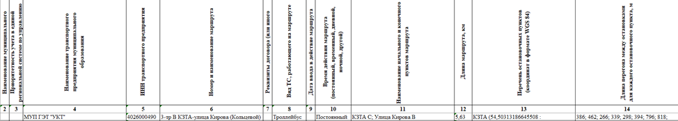 | Наименование начального и конечного пунктов маршрута | Названия начальной и конечной остановок маршрута. |