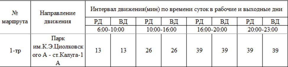 | Направление движения | Описание направления маршрута (например, "Парк им.К.Э.Циолковского А – ст.Калуга-1 А"). |