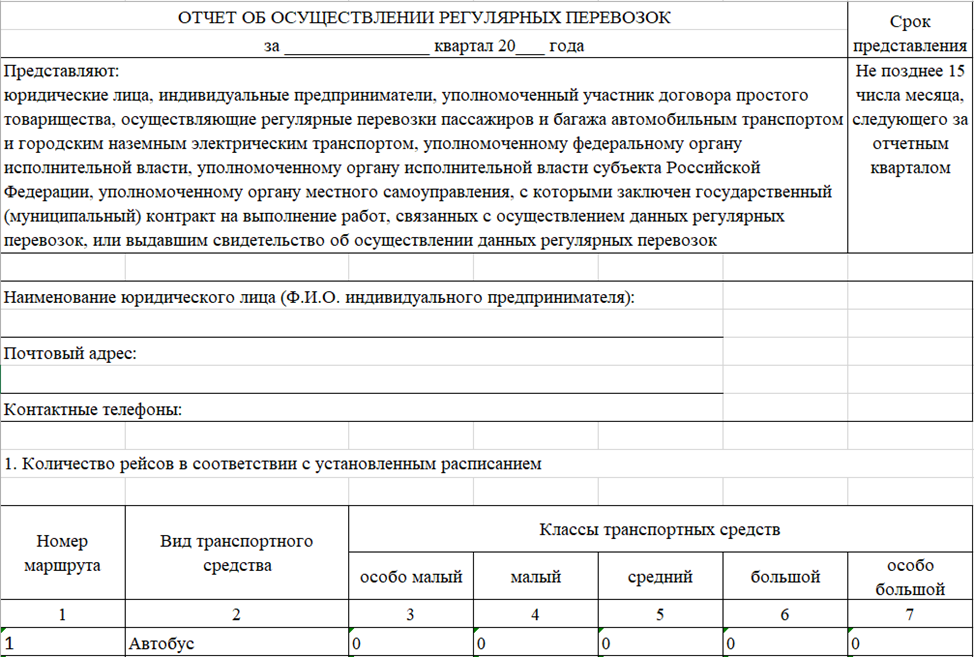 Отчёт представляет собой официальный документ, заполняемый перевозчиками для предоставления в уполномоченные органы исполнительной власти (федеральные, региональные или муниципальные). Содержит данные о выполнении регулярных перевозок по заключённым государственным (муниципальным) контрактам или выданным свидетельствам. Включает информацию о перевозчике, контактные данные и детализацию количества рейсов по каждому маршруту с распределением по классам используемых транспортных средств. Используется для контроля исполнения обязательств по перевозкам, планирования транспортного обслуживания и формирования официальной статистики.