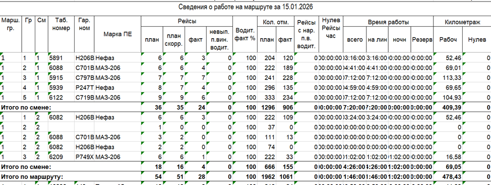 Отчёт предназначен для обобщённого анализа работы подвижного состава и водителей на конкретном маршруте за отчётный период. Он отражает выполнение плановых и скорректированных показателей по рейсам, фактическое время работы, километраж, а также фиксирует случаи невыполнения и нарушений по вине водителей. Отчёт используется для контроля эффективности работы маршрута и принятия управленческих решений.
