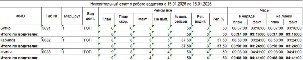 Данный отчёт предназначен для комплексного анализа производственной деятельности водителей за заданный накопительный период. Он отражает степень выполнения плановых заданий по рейсам и времени работы, позволяет отслеживать динамику регулярности движения и дисциплину выполнения нарядов. Отчёт служит инструментом для оценки эффективности использования трудовых ресурсов, анализа причин невыполнения транспортной работы.