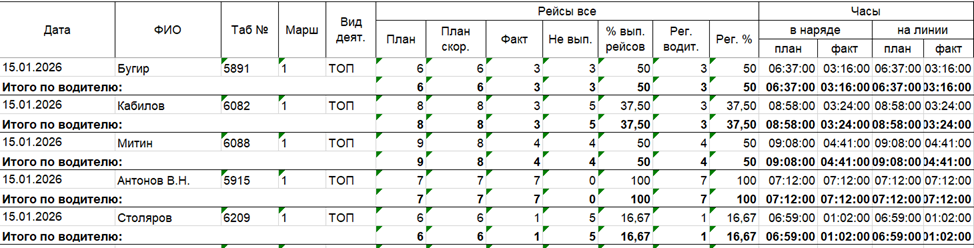 Отчёт предназначен для оперативного анализа работы водителей за конкретный день. Он отражает выполнение суточного плана по рейсам, уровень соблюдения расписания и фактические затраты рабочего времени. Отчёт используется для ежедневного контроля деятельности водителей и оперативного выявления отклонений.