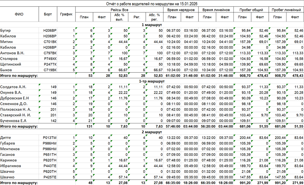 Отчёт предназначен для оперативного анализа работы водителей по маршрутам за выбранный период. Он отражает выполнение плана по рейсам и пробегу, а также использование рабочего времени. Отчёт используется для оценки эффективности работы водителей и транспортных средств на маршрутах.