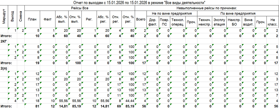 Отчёт предназначен для детального анализа выполнения рейсов по маршрутам с указанием причин невыполнения. Он отражает плановые и фактические показатели и разделяет сбои по виновным сторонам. Отчёт используется для выявления системных проблем и ответственности за невыполнение графика.