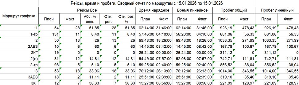 Отчёт предназначен для комплексного анализа эффективности работы по каждому маршруту за период. Он объединяет данные по выполнению рейсов, использованию времени и пробегу транспорта. Отчёт используется для оценки общей производительности маршрутов и выявления проблемных участков.