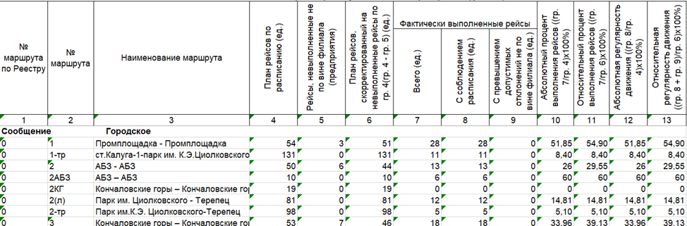 | Относительный процент выполнения рейсов ((гр. 7/гр. 6)х100%) | Процент выполнения рейсов от скорректированного плана (за вычетом внешних отмен). Показывает, насколько предприятие справилось с выполнимой частью плана. |