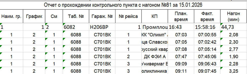 Отчёт предназначен для контроля за соблюдением времени движения между контрольными пунктами (КП) на маршруте. Он фиксирует случаи опережения графика («нагон») и показывает, на какой конкретно перегон он пришёлся. Отчёт используется для анализа скорости движения и выявления нарушений интервалов движения.