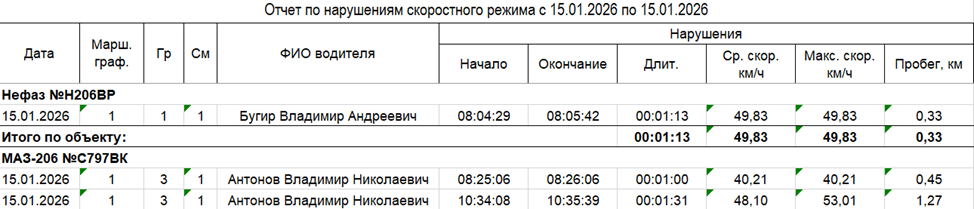 Отчёт предназначен для контроля превышения установленной скорости движения транспортными средствами. Он фиксирует каждое нарушение с указанием времени, средней и максимальной скорости на участке. Отчёт используется для анализа соблюдения водителями ПДД, обеспечения безопасности и принятия дисциплинарных мер. Необходимо указание минимального времени превышения и скорость от которой считается превышение.
