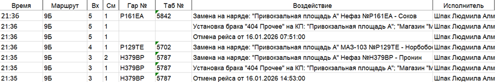 Отчёт предназначен для журналирования всех управляющих воздействий, выполненных конкретным пользователем (диспетчером) в системе. Он отражает изменения в графике движения, замены транспорта, отмены рейсов и другие оперативные решения. Отчёт используется для контроля действий диспетчерского персонала, анализа их работы и обеспечения прозрачности оперативного управления.