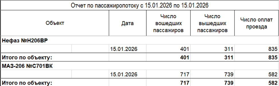 Отчёт предназначен для анализа загрузки транспортных средств пассажирами. Он отражает количество посадок, высадок и оплат проезда по каждому автобусу. Отчёт используется для оценки востребованности маршрутов, контроля выручки и оптимизации вместимости подвижного состава.