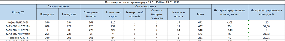 Отчёт предназначен для анализа загрузки и доходности каждого конкретного транспортного средства. Он отражает общий пассажиропоток, структуру оплаты и уровень безбилетного проезда по каждому автобусу. Отчёт используется для оценки эффективности работы единиц техники, контроля выручки и выявления проблемных транспортных средств.