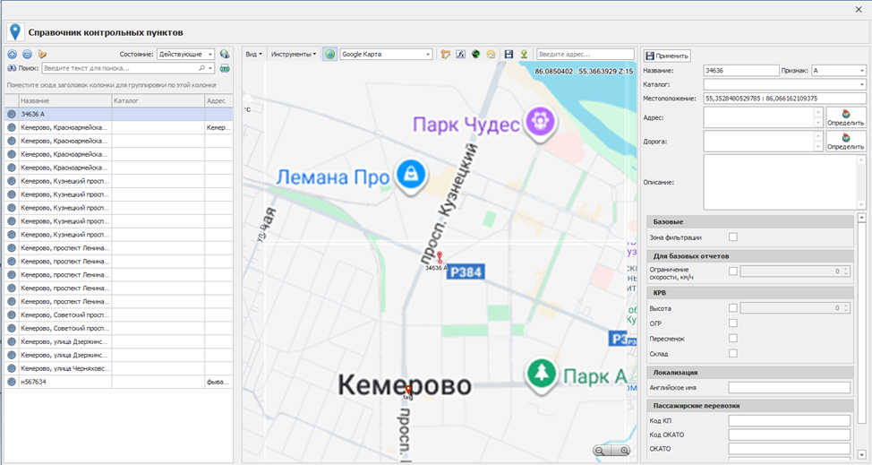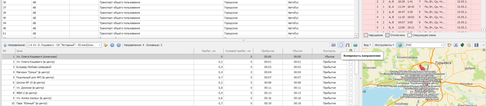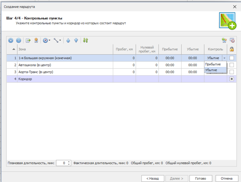 Для начального контрольного пункта в каждом направления устанавливается условия, контролировать время убытия транспортного средства, а не прибытия как это стоит по умолчанию. Для внесения изменений выберите КП и в колонке контроль выберете убытие. На конечном остановочном пункте расстояние между остановками равно «нулю».