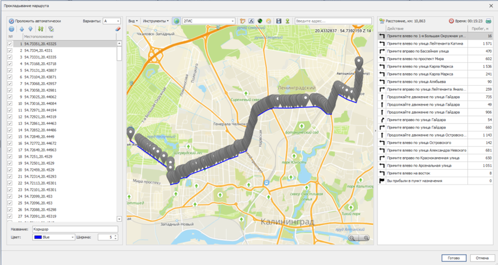 В открывшемя окно, необходимо нажать «Проложить автоматически». После нажатия кнопки, коридор будет построен на основании выставленных КП, на предыдущем шаге. В данном окне, внизу слева, выможете измени название коридора, цвет и задать ширину.